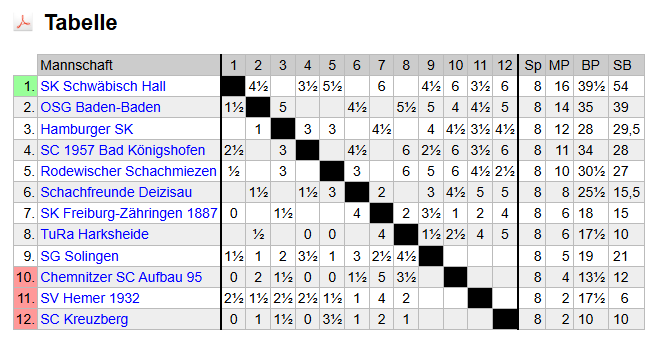 Der SK Schwäbisch Hall hat sich nach seinem Sieg im Spitzenspiel gegen die OSG Baden-Baden leicht an der Tabellenspitze abgesetzt und geht als klarer Favorit in die Endrunde der Bundesliga. Diese findet vom 17. bis 19. April in Bad Königshofen statt.