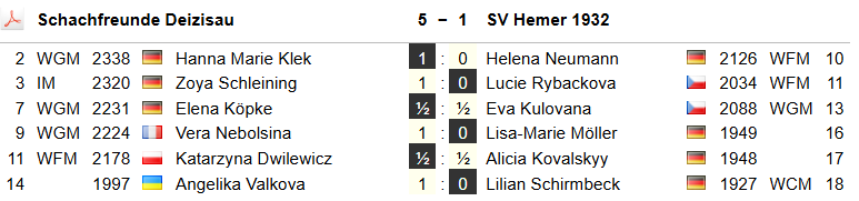 Am Samstag gab es gegen Hemer einen klaren 5:1-Erfolg. Siege von Hanna Marie Klek, Zoya Schleining, Vera Nebolsina und Angelika Valkova sorgten früh für klare Verhältnisse. Lediglich Elena Köpke und Katarzyna Dwilewicz mussten sich mit Remis begnügen.