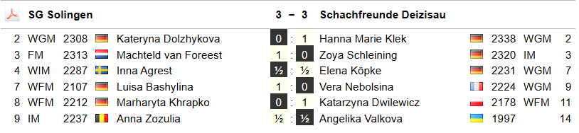 Am Sonntag ging es gegen Solingen – mit der Deutschen Meisterin von 2023 Kateryna Dolzhykova am Spitzenbrett – deutlich enger zu. Klek bestätigte ihre Ausnahmerolle mit einem Sieg gegen Dolzhykova, auch Dwilewicz punktete voll. Mit Vera Nebolsinas Niederlage war ebenso wenig zu rechnen wie mit dem Remis von Angelika Valkova gegen die favorisierte Zozulia.