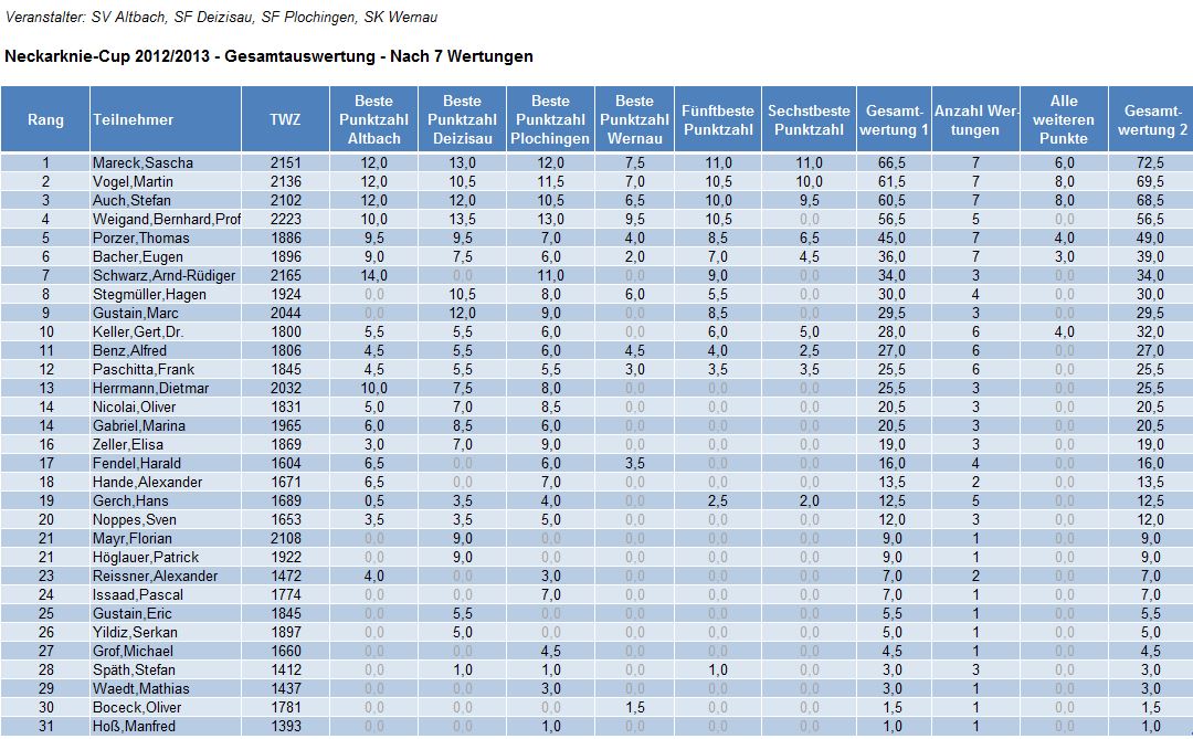 Bernhard Weigand hat in Plochingen die dritte Ausgabe des Neckarknie-Cups gewonnen. Mit 13 Punkten aus 14 Spielen konnte er sich durchsetzen und ließ nur 2 Remisen zu. Den zweiten Platz belegte Sascha Mareck mit 12 Punkten. Sascha führt auch weiterhin die Gesamtrangliste an. Den dritten Platz belegte Arnd-Rüdiger Schwarz. Er erzielte 11 Punkte.