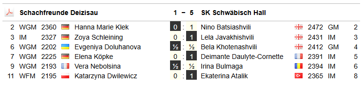 Etwas unerwartet verlor Deizisau am letzten Spieltag gegen Harksheide. Die Elozahlen sprachen eigentlich eher für Deizisau, doch es sollte nicht sein. Hanna Marie Klek hielt sich gegen Julia Antolak schadlos. Auch Vera Nebolsina holte einen schönen Sieg gegen Katerina Bräutigam.