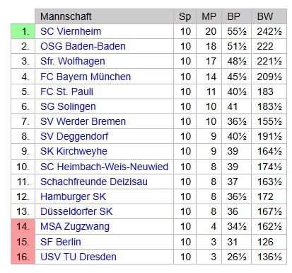 Gegen die Pfälzer erreichten wir ein leistungsgerechtes Unentschieden. Tamas Banusz musste sich dem Polen Kosakowski geschlagen geben, dafür glich unser Altmeister Zdenko Kozul am achten Brett mit einem Sieg gegen den Ukrainer Roshka aus. Die übrigen Partien endeten remis, darunter auch die Begegnungen unserer Nationalspieler Matthias Blübaum und Dmitrij Kollars.