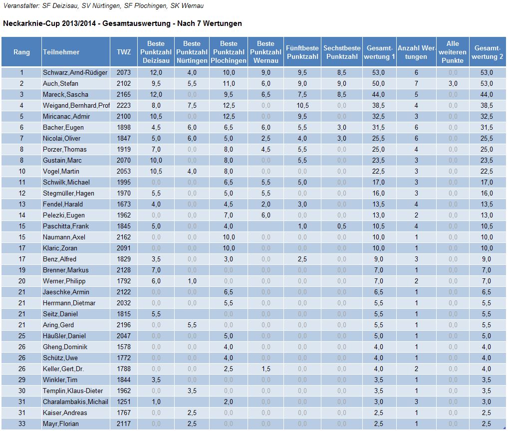Die Württembergischen Fraueneinzelmeisterschaften wurden in diesem Jahr erstmals parallel zu einem großen offenen Turnier ausgetragen, dem Altbacher DWZ-Turnier. Die Teilnehmerinnen kämpften um den gut gefüllten Preisfonds und den Startplatz bei den Deutschen Frauenmeisterschaften. Besonders spannend war der Kampf um den Platz an der Spitze zwischen unseren beiden Bundesligaspielerinnen Marina Noppes und Simona Gheng. In der direkten Partie konnte Marina in einem hervorragenden Endspiel ihren Stellungsvorteil verwerten und sicherte sich den wichtigen Punkt. Am Ende hatte sie alle vier Spiele gewonnen und sicherte sich damit souverän den Meistertitel und die Qualifikation für die Deutsche Frauenmeisterschaft 2015. Simona Gheng wurde Zweite. Herzlichen Glückwunsch!
